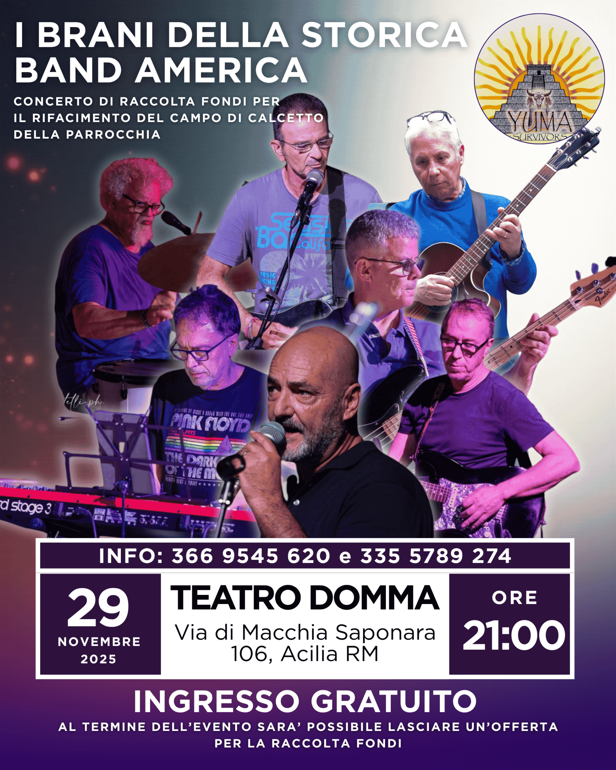 Il 29 NOVEMBRE 2025 al Teatro Domma, un concerto gratuito per sostenere la raccolta fondi per il rifacimento del campo di calcetto della Parrocchia.