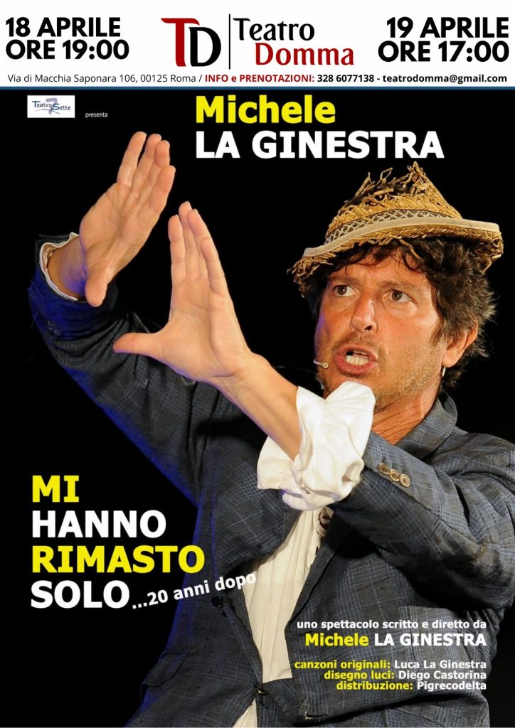 In “Mi hanno rimasto solo” Michele La Ginestra gioca con un palcoscenico vuoto e racconta al Teatro il suo sogno: poter interpretare ogni sera un personaggio diverso. Il Teatro lo ascolta e decide di diventare suo complice; apre il cassetto dei ricordi e gli fa trovare testi, costumi, musiche, per realizzare il suo spettacolo. Questa “cavalcata” teatrale fatta di pezzi inediti e filastrocche comincia da un omaggio ad Ettore Petrolini dei primi del Novecento. Lo spettacolo, nato nel 2003, ha avuto successive versioni (“…revival” nel 2007 e “…dieci anni dopo” , fino al “…20 anni dopo”) e non è mai uguale a sé stesso, pur mantenendo una linea drammaturgica che non può e non deve mai cambiare.