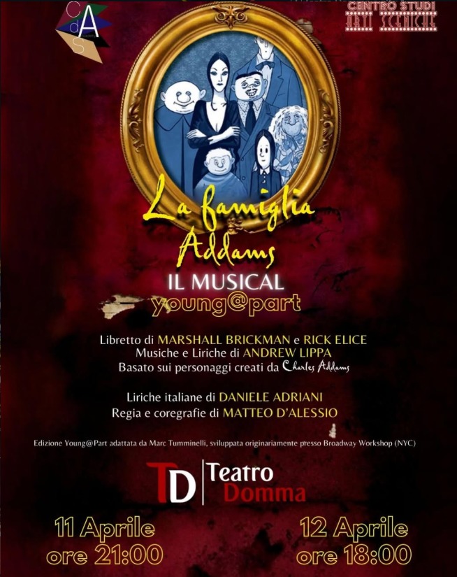 Gomez, Zio Fester, Morticia, Mercoledì, Pugsley e tutti i loro stravaganti amici...ovvero la famiglia più eccentrica, misteriosa e divertente di sempre in uno spettacolo pieno di musica, danza e comicità, interpretato da giovani talenti under19, che porteranno sul palco tutta l’energia e l’ironia di questo amatissimo musical con musiche di Andrew Lippa e libretto di Marshall Brickman e Rick Elice, basato sui personaggi creati da Charles Addams.